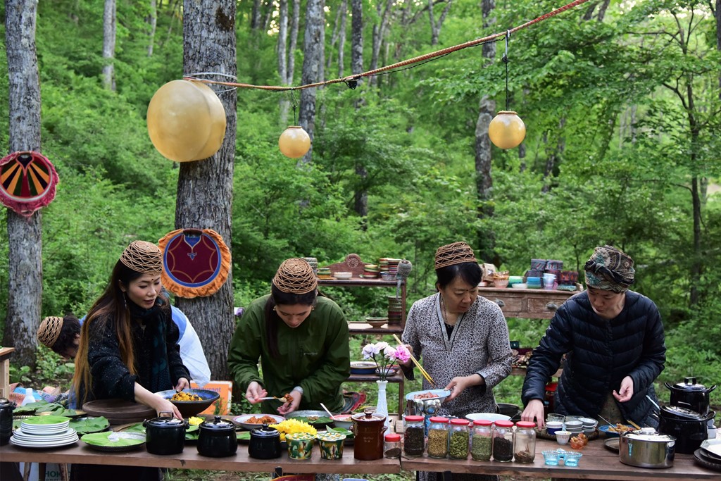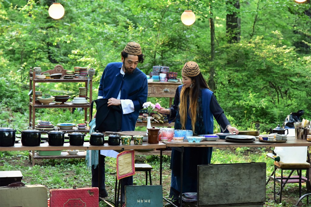 インドのアンティーク家具を森の中に運び、