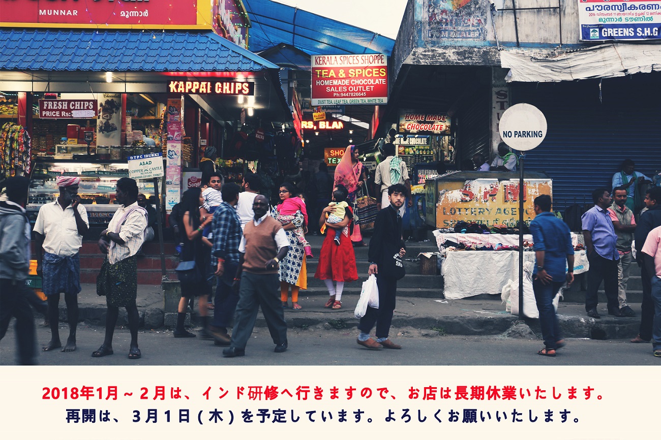 インド研修へ行きますので、お店は長期休業いたします。