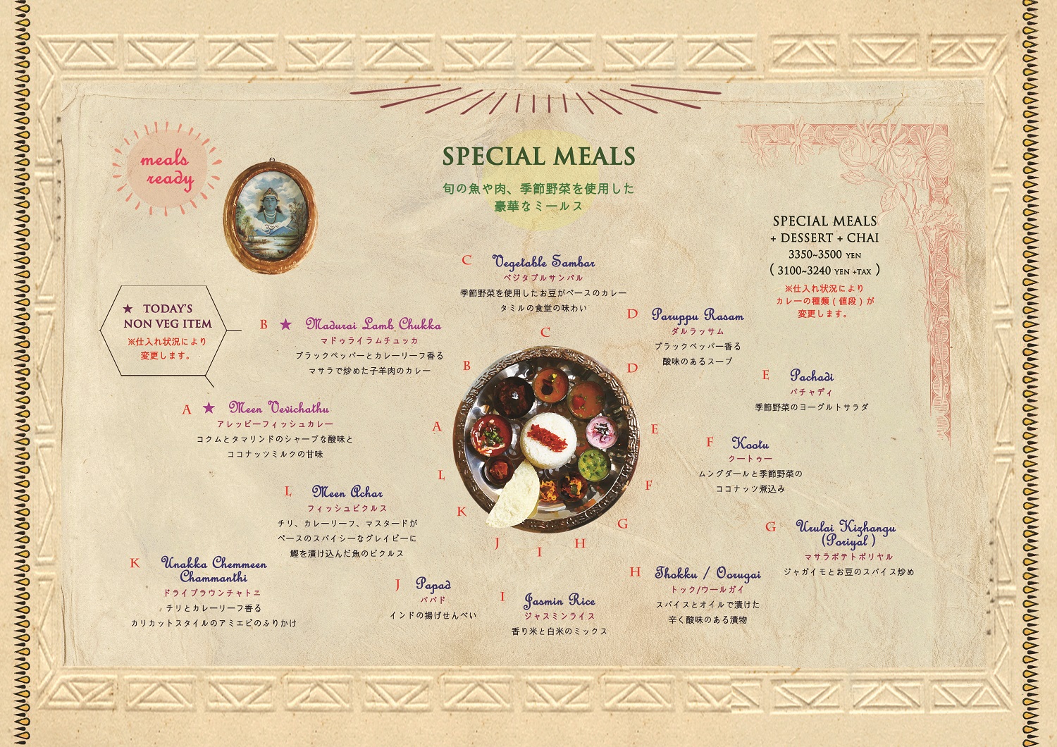 旬の魚や肉、季節野菜を使用した、豪華なミールスです。