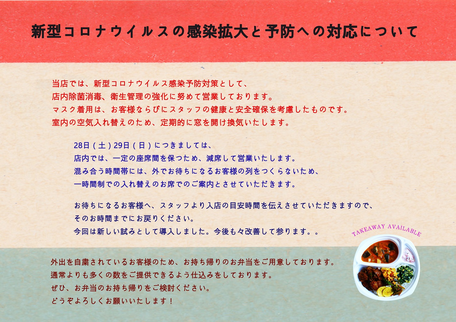 店内では、一定の座席間を保つため、減席して営業いたします。