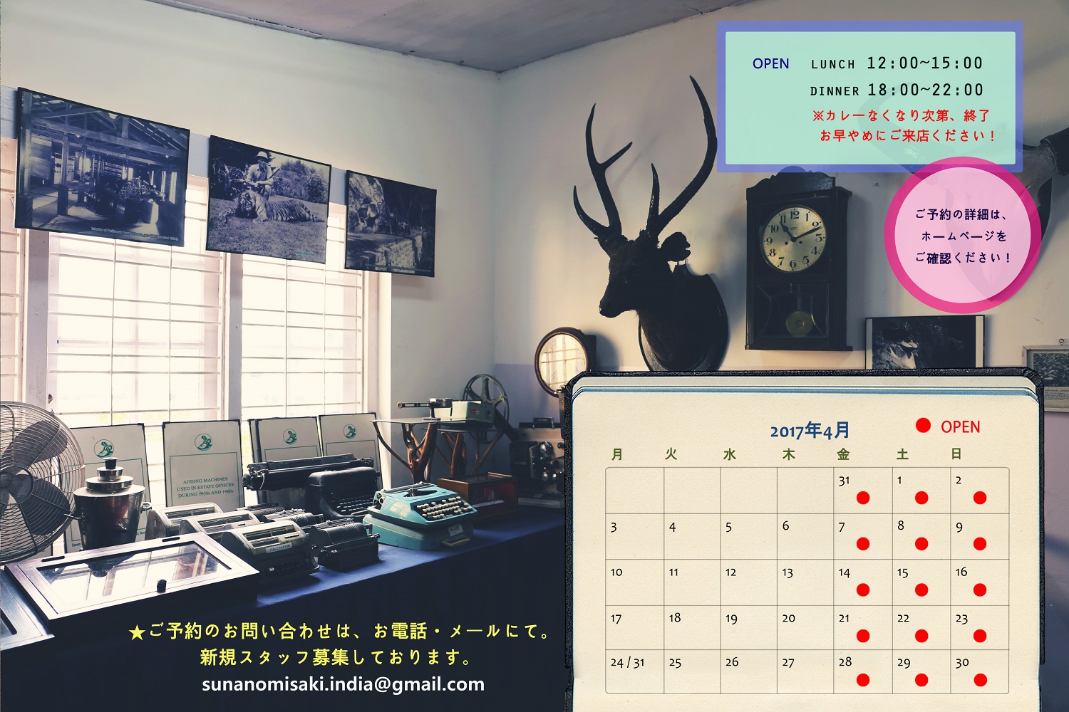 メールにてご予約の場合 → sunanomisaki.india@gmail.com