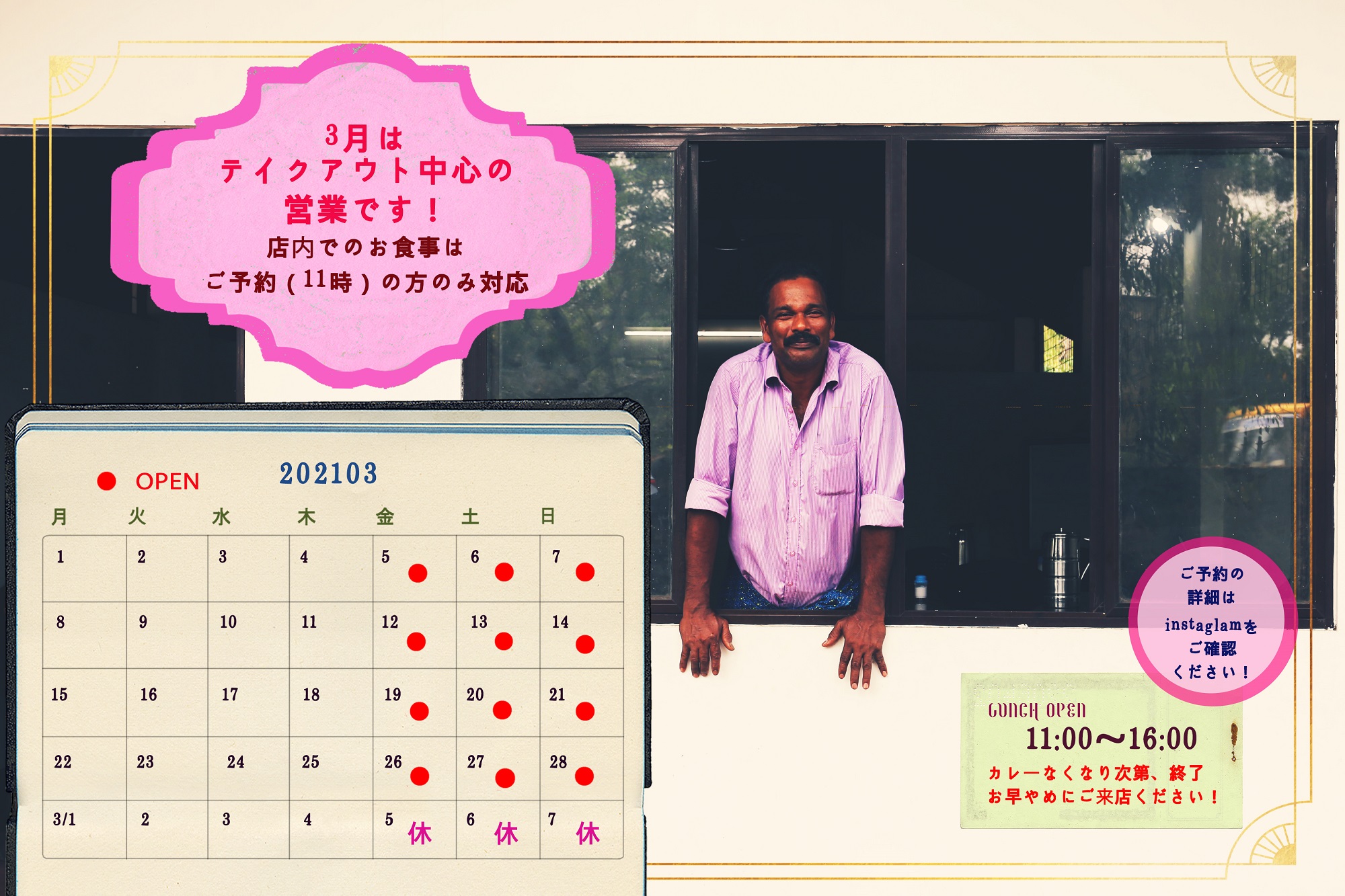 3月はテイクアウト中心の営業です。